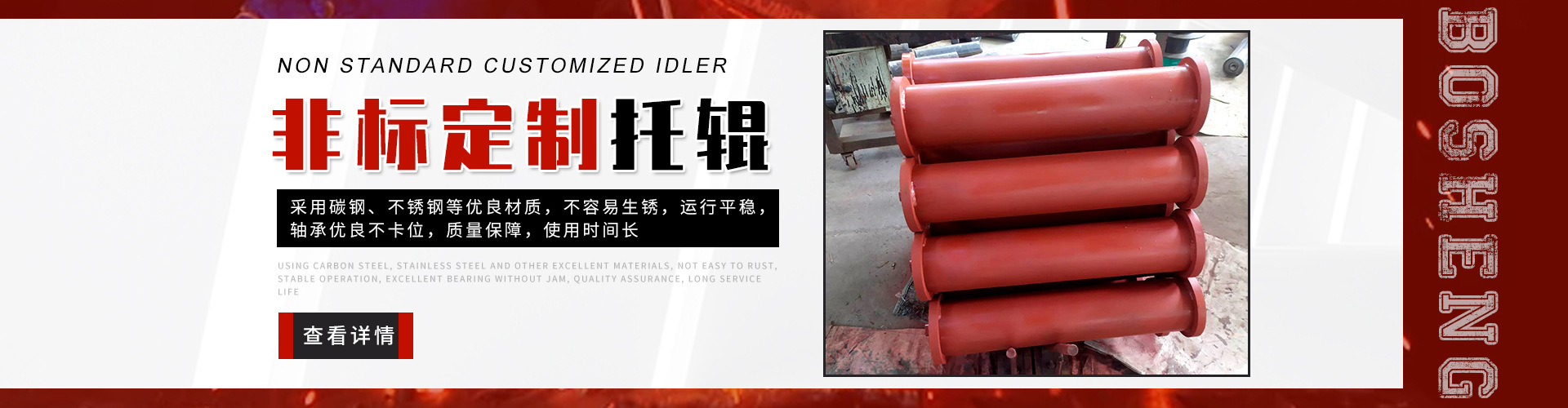 泰安博晟礦山機(jī)械有限公司位于山東泰安新泰市汶南鎮(zhèn)陳糧村。緊鄰京滬、京福、萊新高速公路。公路交通極為方便,環(huán)境優(yōu)美。公司主要生產(chǎn):托輥、托輥配件、托輥支架等皮帶輸送機(jī)配件。歡迎各界商友前來洽談考察。聯(lián)系電話:13954880316. 泰安博晟礦山機(jī)械有限公司采用國際標(biāo)準(zhǔn)設(shè)計(jì)、制造技術(shù),將托輥的設(shè)計(jì)和制造提高到了一個(gè)更高的水平,生產(chǎn)的托輥具有小的旋轉(zhuǎn)阻力,長的壽命,小的維修工作量和高的承載能力。鋼管采用托輥專用高頻焊管,管內(nèi)做去刺處理,圓度控制在特殊的公差范圍之內(nèi)。軸是按標(biāo)準(zhǔn)公差加工的冷拉鋼制造。軸承座采用進(jìn)口冷扎鋼板經(jīng)多次工藝沖壓而成。托輥管和軸承座被自動(dòng)焊接機(jī)械手焊接在一起,形成一個(gè)具有很高強(qiáng)度的整體構(gòu)造。托輥軸承采用國內(nèi)外知名品牌的大游隙深溝球雙密封軸承,使托輥具有理想的靜平衡和動(dòng)平衡,其旋轉(zhuǎn)阻力優(yōu)于國標(biāo)。托輥密封采用綜合國外和國內(nèi)迷宮式密封的特點(diǎn)進(jìn)行了專門設(shè)計(jì),內(nèi)充耐高速高溫和超低溫抗氧化鋰基酯,有效防止雜質(zhì)、水、空氣對托輥內(nèi)部的侵蝕。 目前我們托輥系列產(chǎn)品有槽形上調(diào)心托輥組、槽形托輥、槽形下調(diào)心托輥組、承載托輥、緩沖托輥、回程托輥組、螺旋托輥、摩擦上調(diào)心托輥組、平行緩沖托輥組、平行上調(diào)心托輥、礦用托輥、煤礦專用托輥、梳型托輥、樹脂托輥、陶瓷托輥、橡膠托輥、錐形托輥、立輥等。規(guī)格:直徑50-219mm;長度190-2600mm。 泰安博晟礦山機(jī)械有限公司竭誠愿與廣大客戶合作,共同發(fā)展開發(fā)新技術(shù)新項(xiàng)目。泰安博晟礦山機(jī)械有限公司秉承